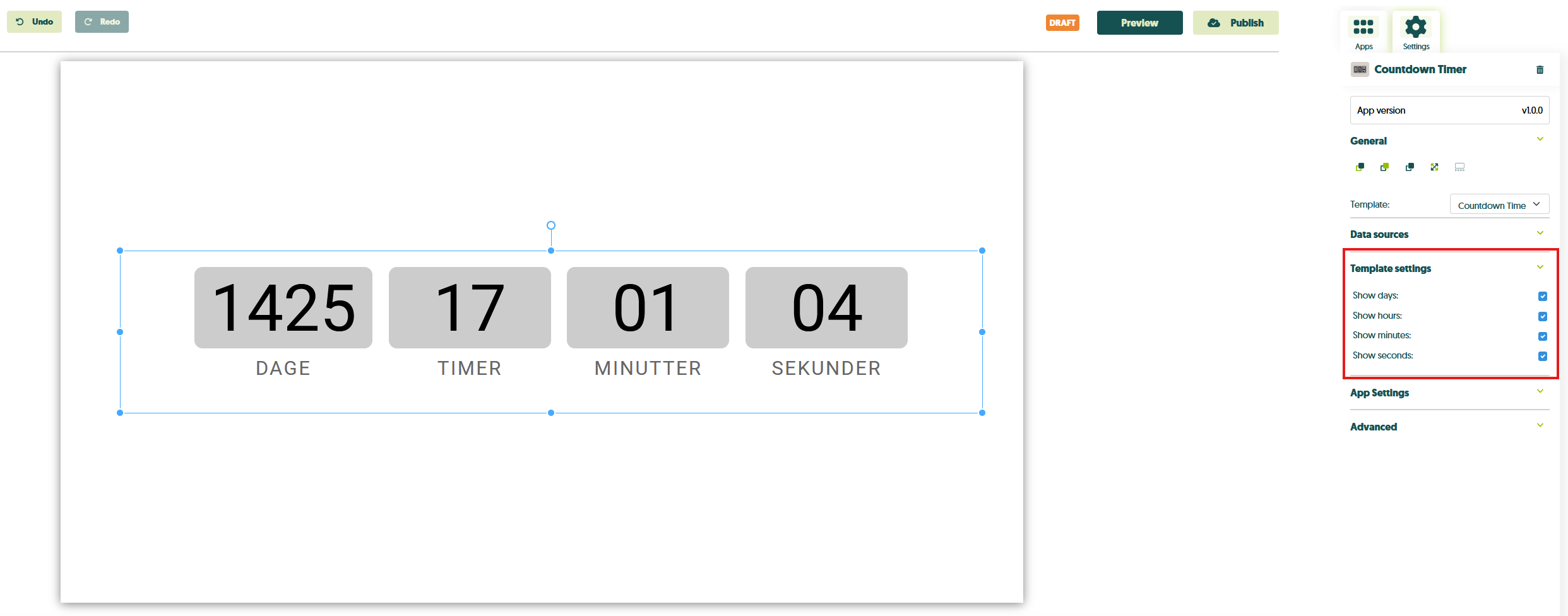 - Start med at indsætte Countdown Timer-appen, enten i et nyt design eller et eksisterende.