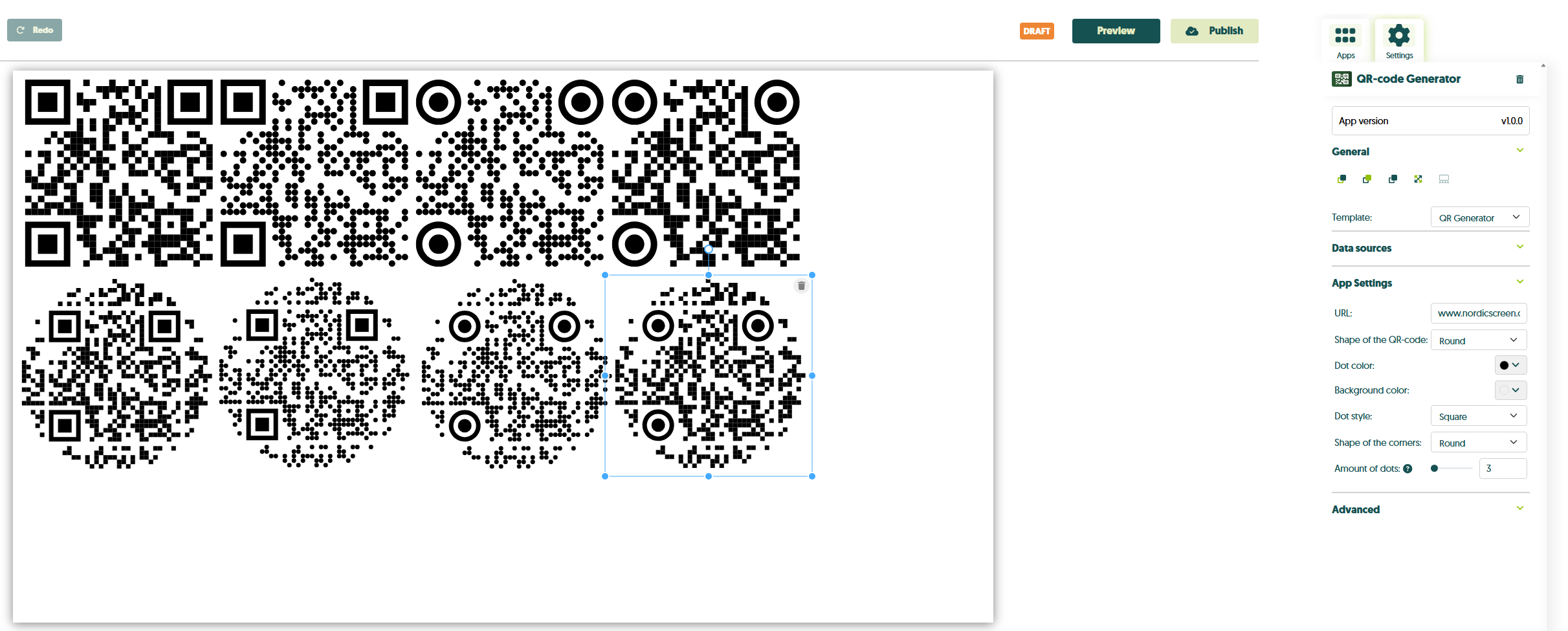 - Amount of dots: Giver dig mulighed for at ændre antallet af prikker i QR-koden. Minimumsværdien er 3, og maksimumsværdien er 20.