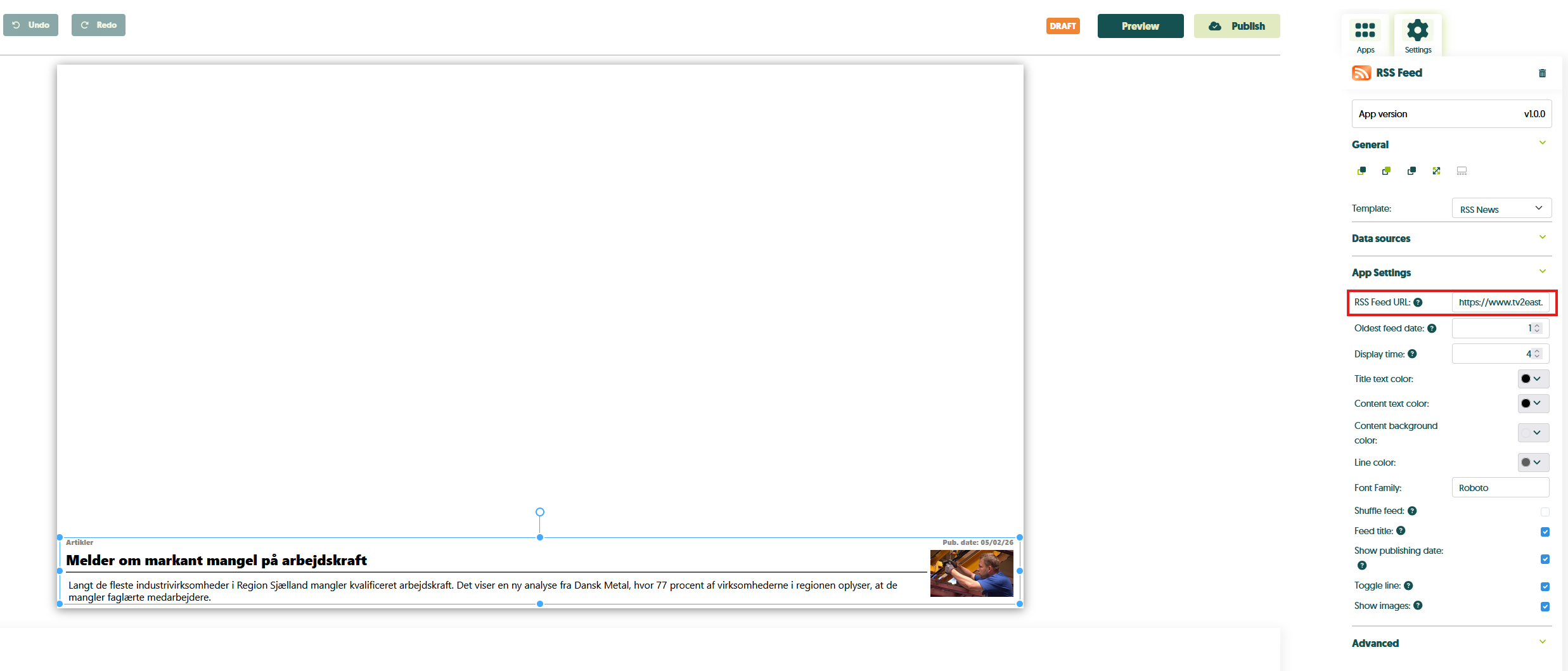 RSS Feed URL: Dette bestemmer, hvilket feed der vises. Du kan altid ændre det, hvis du vil vise noget andet.