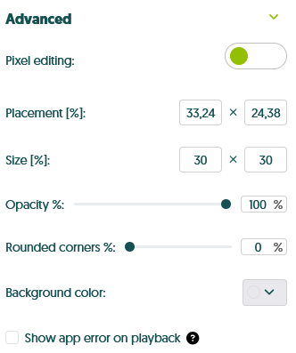 Every app in Q-Play has an Advanced Settings tab. In this tab, you can control your app’s size and placement down to the pixel level. You can also adjust the opacity, background color, and choose whether your app has rounded corners.