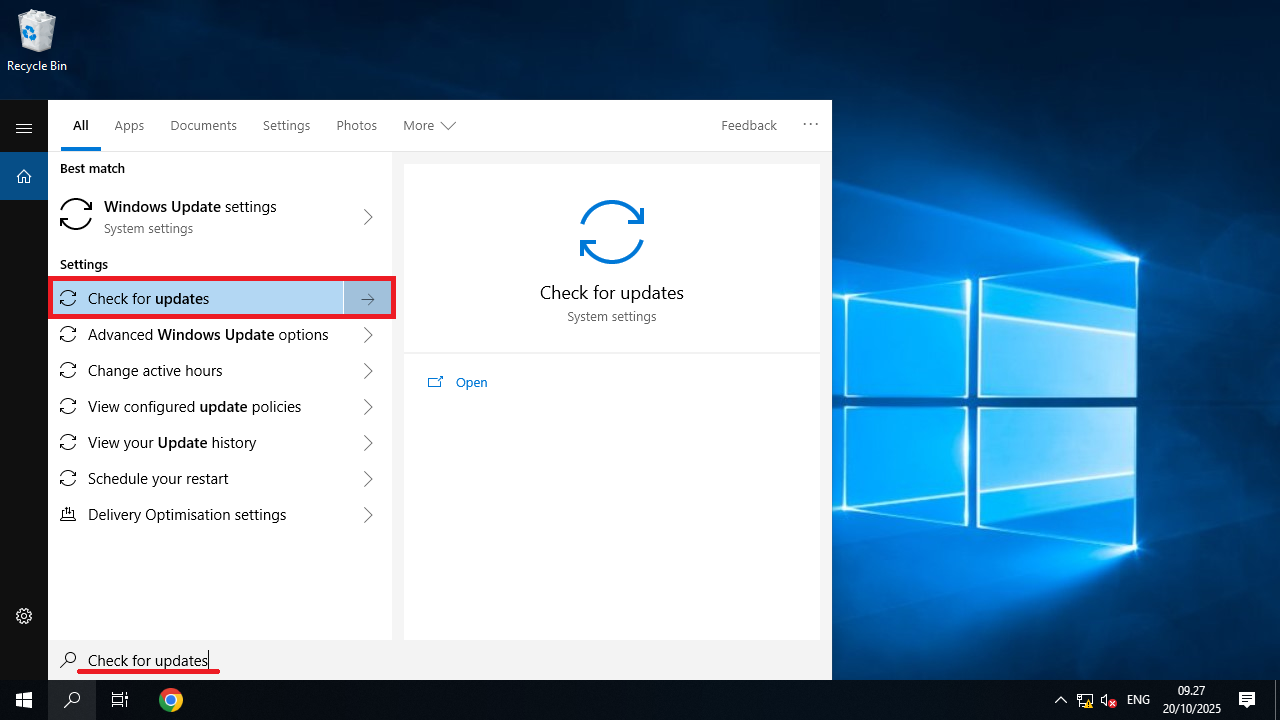 3. In the search bar (magnifying glass), search for "Check for updates", and press this option to open the update window.