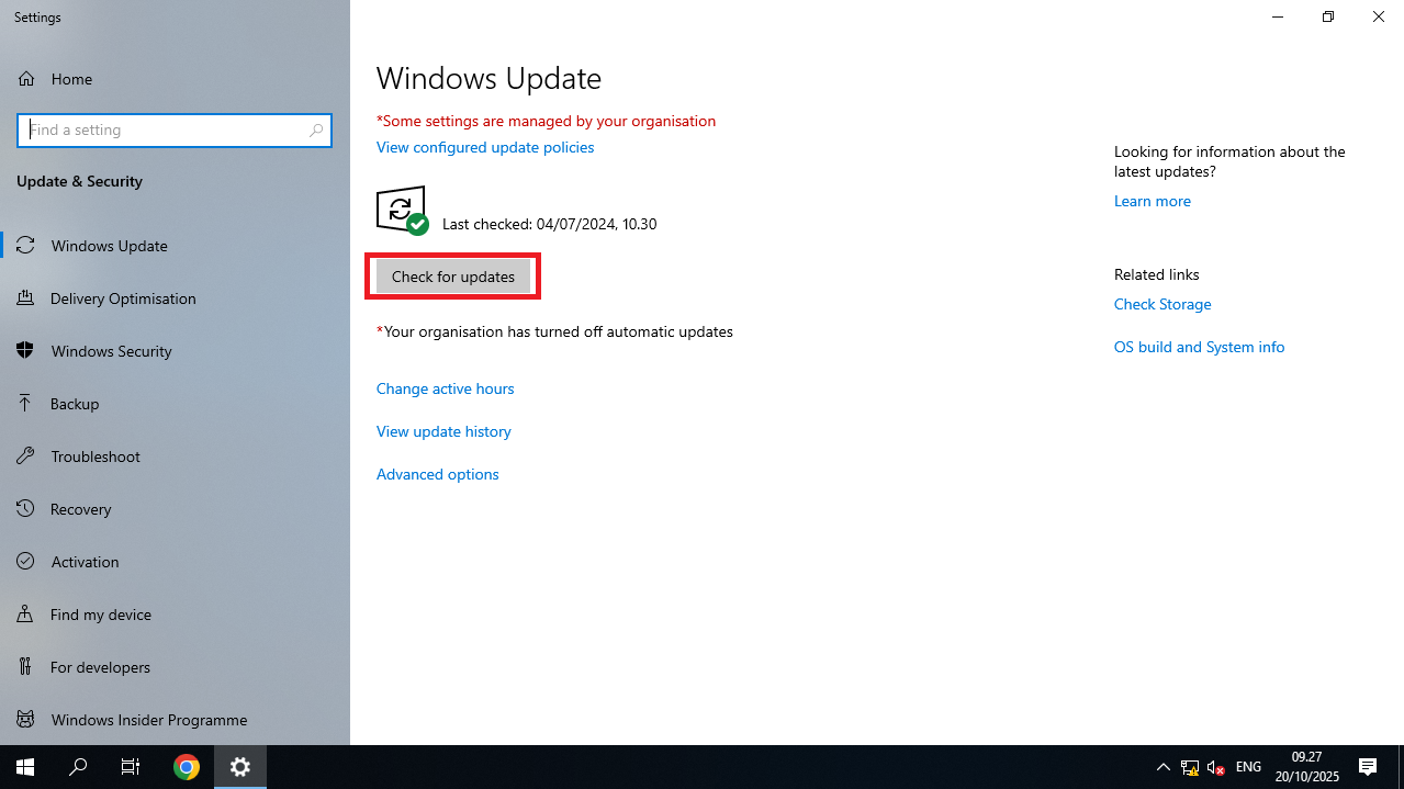 4. In the new window, press the button "Check for updates" – even though this button might have a green tick, look at the date when it last checked for updates. Now let Windows download and install all the updates there is.