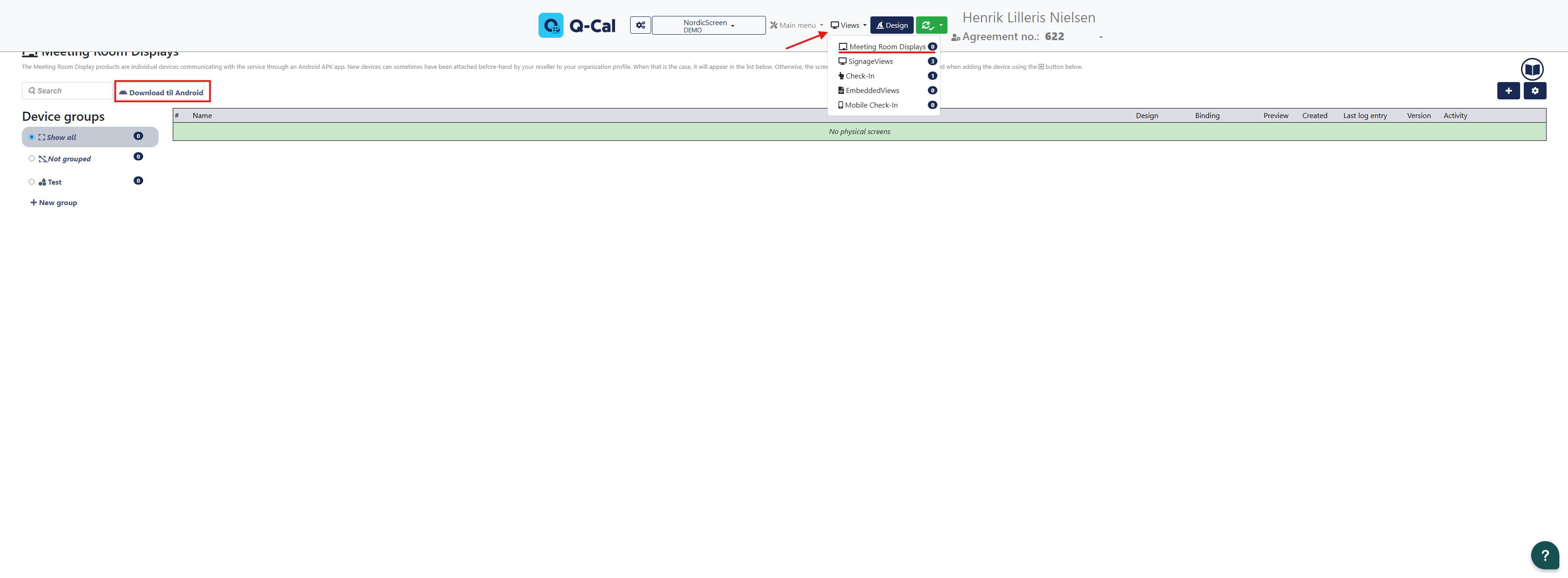 - To install Q-Cal using a USB drive, first log in to your Q-Cal account, press the "Views" button, then go to "Meeting Room Displays" and now press the "Download til Android" and download the latest Q-Cal version. After downloading it, transfer it to a USB drive, and plug this into your device.