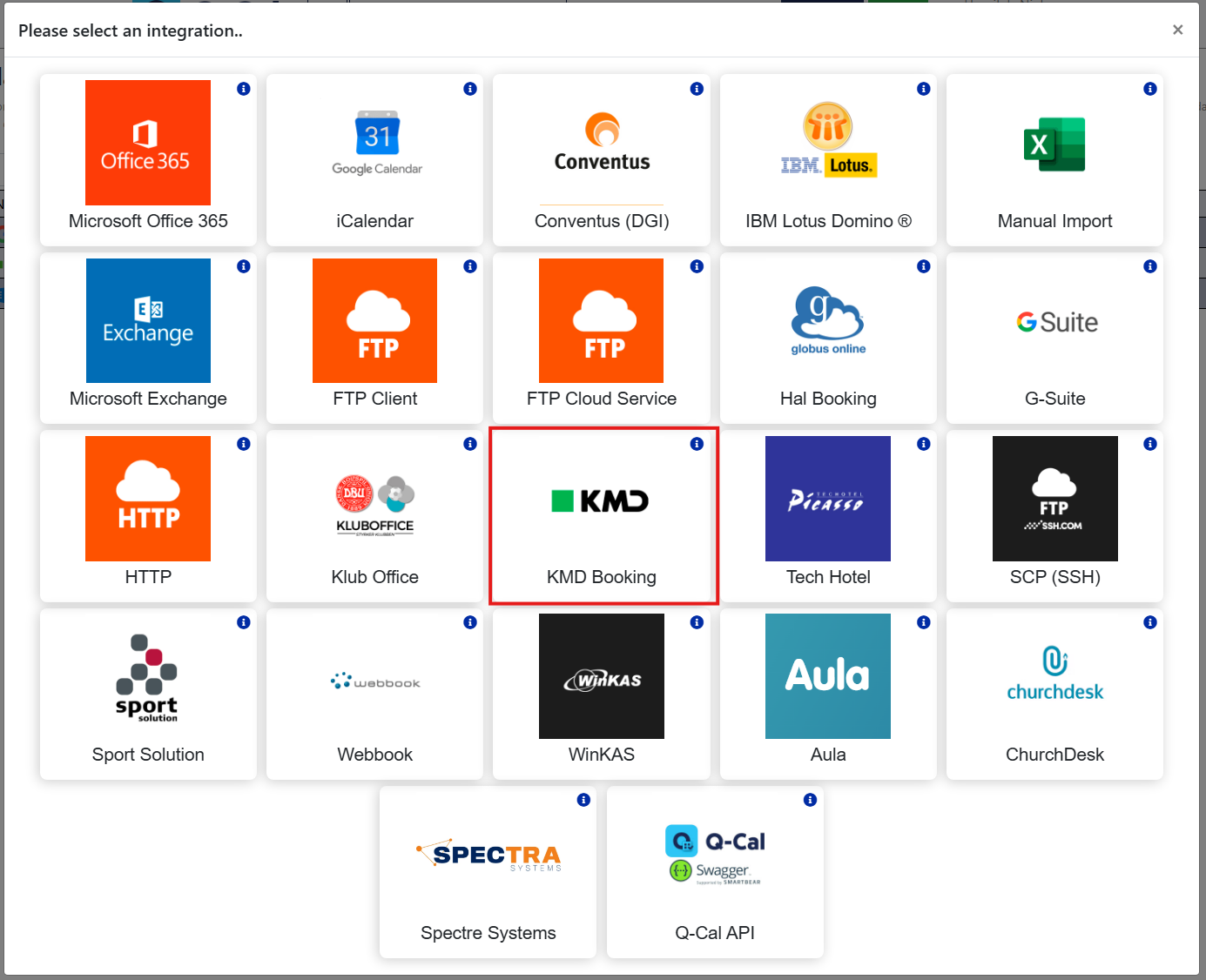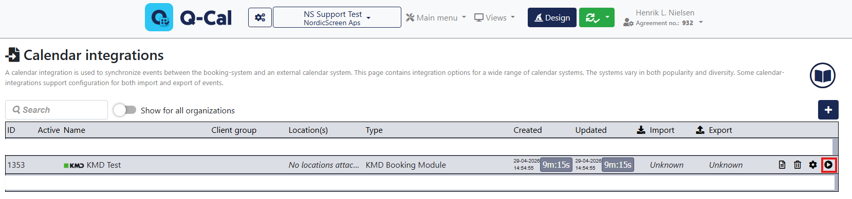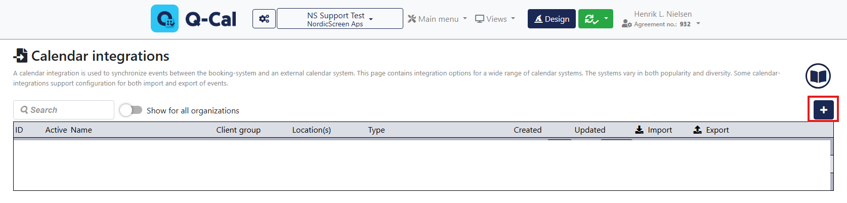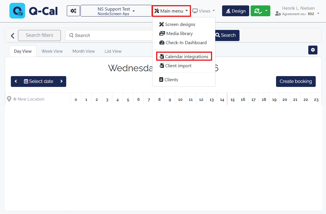 1. The first step, is to login on Q-cal. 2. Now click on Main Menu and select Calender Integrations. 3. Next step, click on the "+" 4. To integrate, click on Hal Booking. 5. Here can you see all the settings for the integration, click on Hal Booking ...