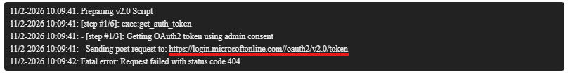 A: This error means: "The page does not exist". This can be caused by multiple issues. If the script log is very short, make sure to press the "save" button after you have authrorized with Microsoft. If there is no ID between the ...microsoftonline.com/ and the /oauth2... Then the autorization isnt saved.